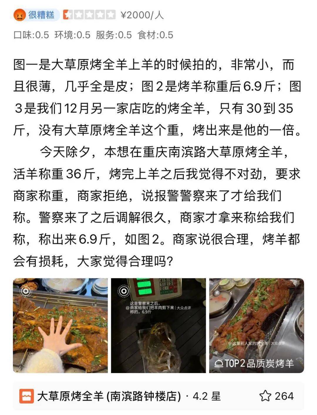 重庆的王女士对媒体反映,除夕夜,她带着家人在大草原烤全羊重庆南滨路钟楼店购买了1188元套餐,活羊称重为36斤。烤完端上来后,王女士觉得有些不太对,“羊特别小还很薄,几乎没有肉。”随后要求商家称重,商家解释羊肉烤完后只剩下四成,拒绝复秤。王女士报警,警方到现场后,商家复秤显示羊肉只有6.9斤。