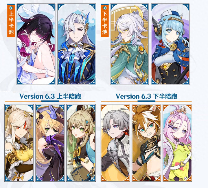 众所周知,原神6.3版本的前瞻将会在本周五的下午一点准时直播,目前卡池消息依旧是上半那维少女,下半兹白伊涅芙,看来这样的卡池安排基本是不会在有改动了。而四星卡池也已经确定下来了,上半是凝光,菲谢尔和绮良良。下半叶洛亚,五郎和爱诺。